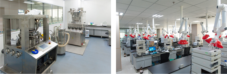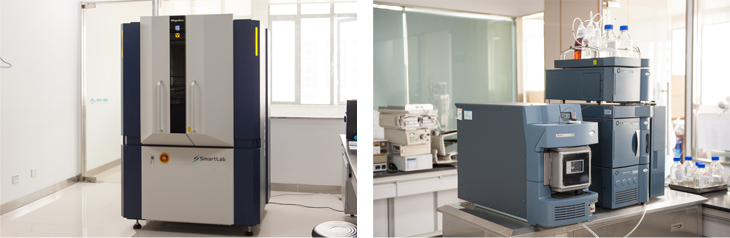 研發中心化學部門擁有150余個全鋼通風櫥及常規有機合成裝置;高溫及低溫反應裝置(5L~100L;-70~+200℃),惰性氣體保護及無水無氧反應系統;0.5L-20L高壓氫化反應釜;API生產基地具備數十臺100L-1000L反應釜及200L高壓氫化反應釜;信息中心擁有SciFinder, Reaxys等專業數據庫來支持各項研發需求,使用CBIS系統數據庫來儲存和管理內部數據。研發中心質量分析和藥物制劑部門主要儀器設備均為國際國內知名品牌: