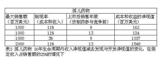 表3從不同的成本和收入角度,即使在高貼現(xiàn)率的情況下,重磅炸彈孤兒藥物也是盈利的。