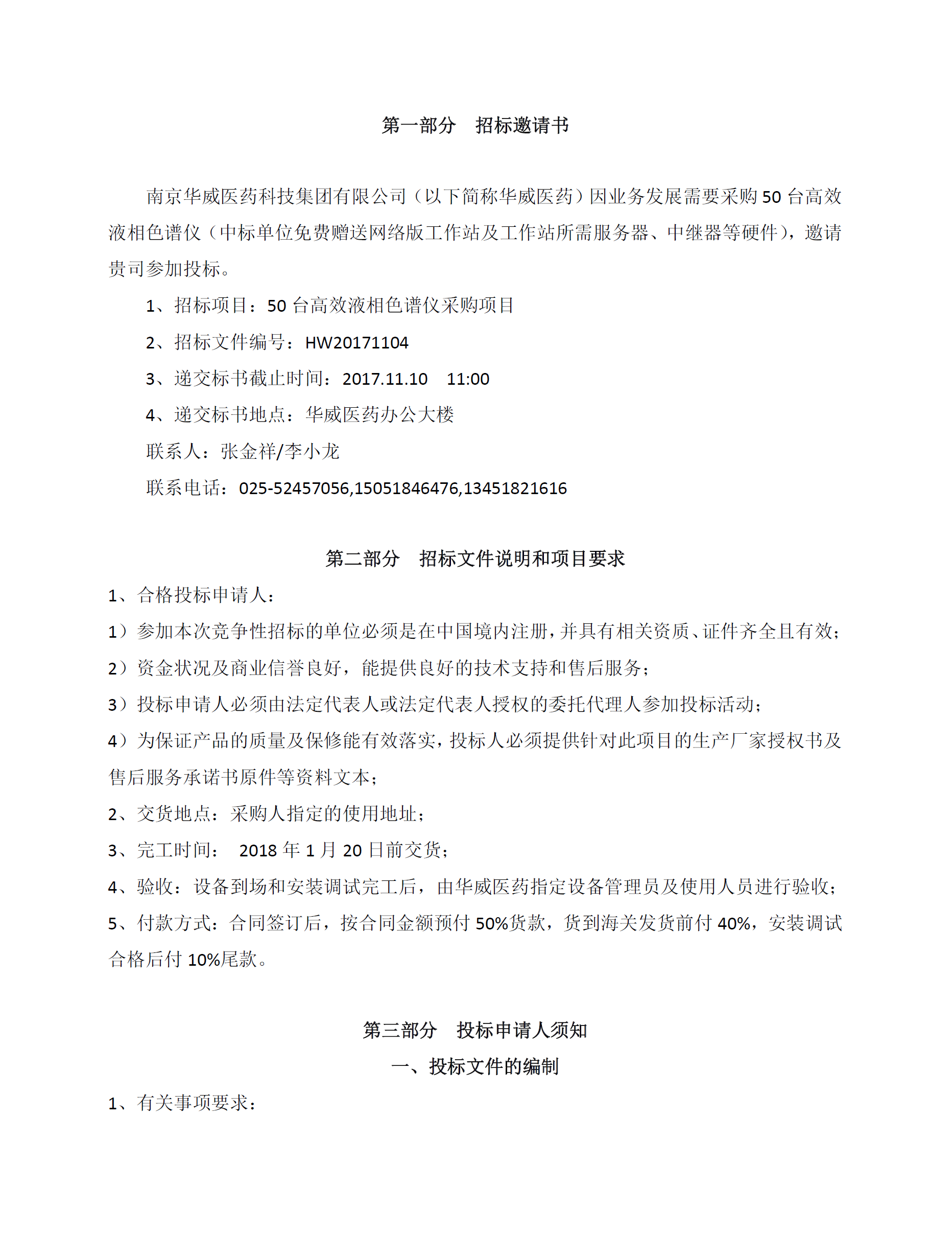 華威醫藥50套高效液相采購項目招標公告