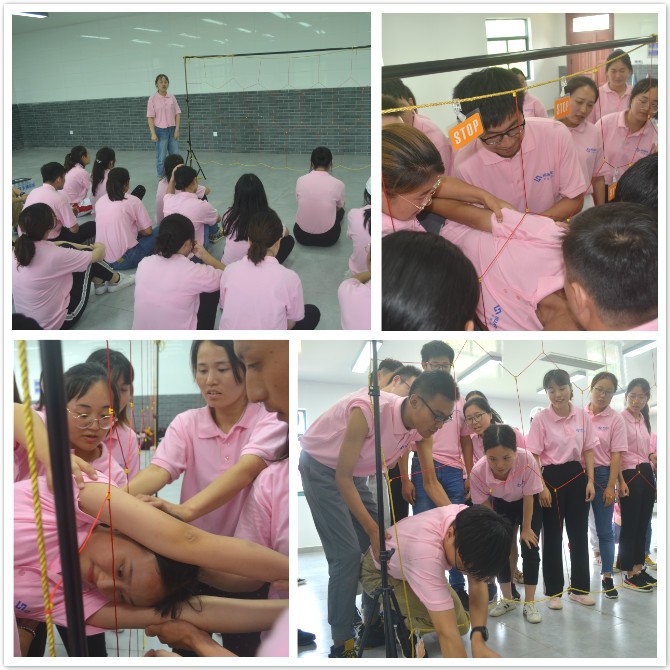 其中,讓大家印象深刻的“生死電網(wǎng)”項目,是需要所有隊員在規(guī)定時間內(nèi)在織好的一張"電網(wǎng)"中通過, 這張網(wǎng)上是大小不一的洞口, 從網(wǎng)的一邊依次通過到達另一邊。因為洞口大小不一,小伙伴在最初穿越的時候,很快就放棄了認為很小且不能穿過的洞口,然而,在教練的指導下,讓許多看似不可能完成的任務,在大家的齊心協(xié)力下被逐個擊破。